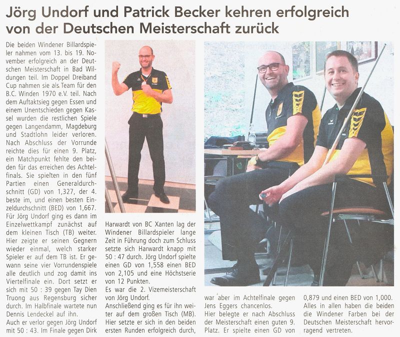 Windener Billardspieler nahmen vom 13. bis . . . . . Bericht
