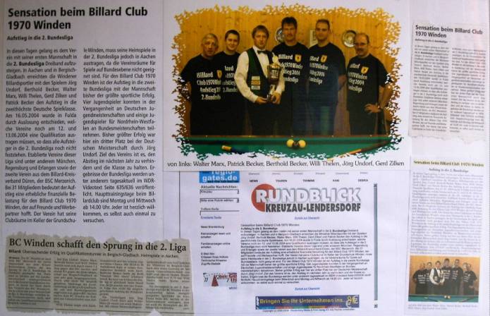 Dieses eine Jahr in der 2. Bundesliga hat die Spieler des BC 1970 Winden um einige Erfahrungen und Erlebnisse bereichert. Schade das der Windener Ausflug in die Welt des deutschen Billardsports bereits nach einem Jahr beendet ist. |